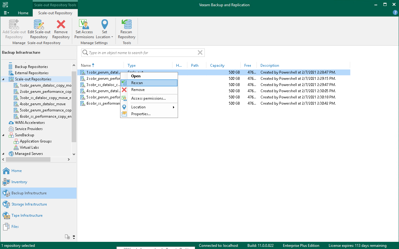 - In the working area, select the scale-out repository and click Rescan Repository on the ribbon or right-click the scale-out backup repository and select Rescan.