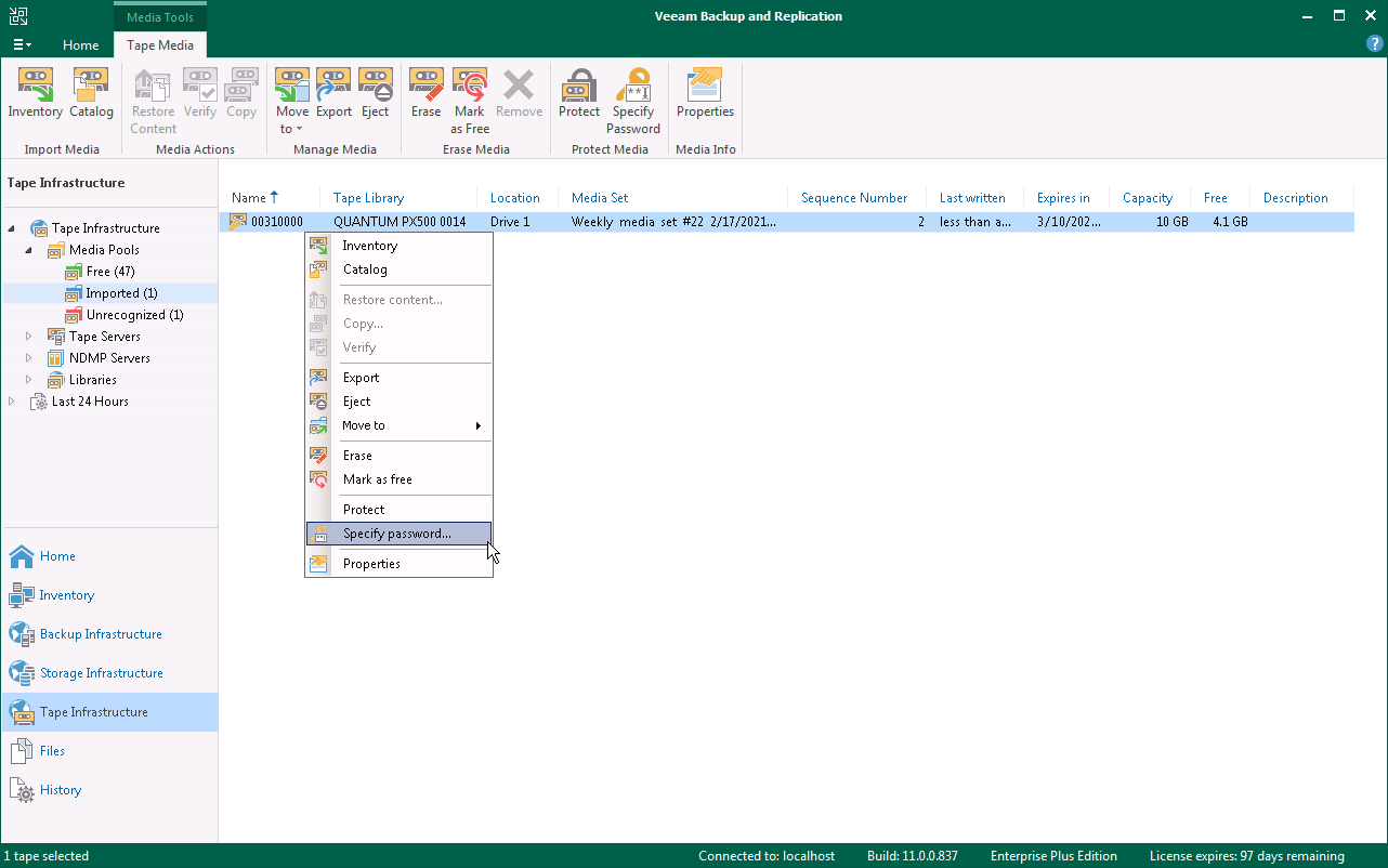 - In the working area, select the imported tape and click Specify password on the ribbon or right-click the tape and select Specify password.
