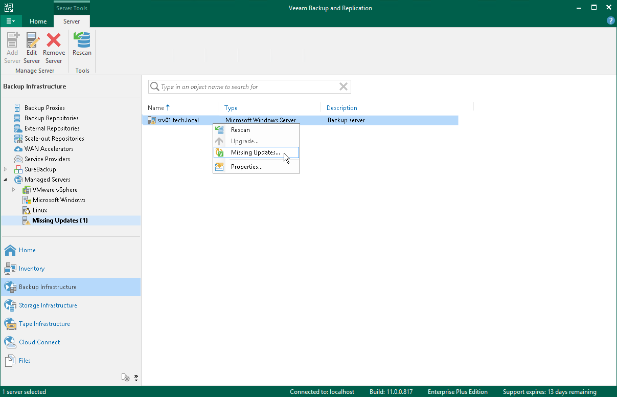 You can also see available updates in the Managed Servers > Missing Updates node in the Backup Infrastructure view.