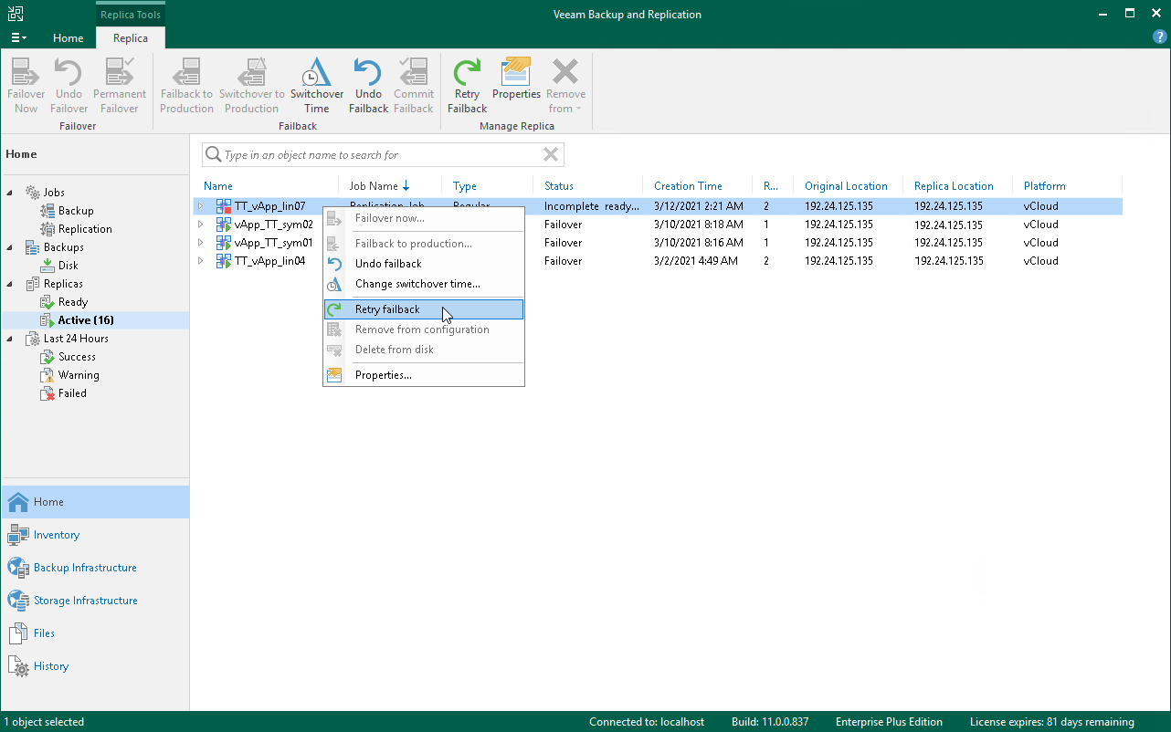 - In the working area, select the necessary vApp and select Retry Failback on the ribbon. Alternatively, you can right-click the necessary vApp and select Retry failback.