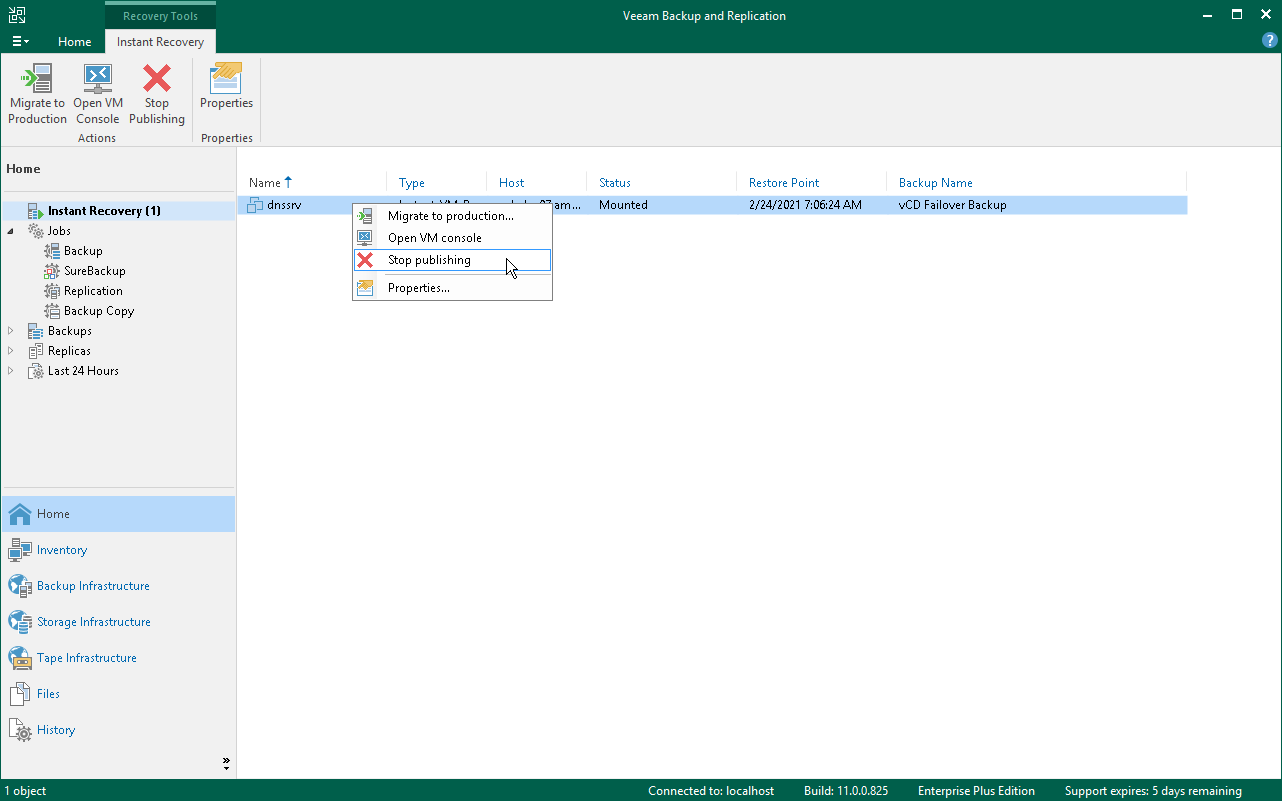 All VMs restored with Instant Recovery are displayed in the Home view, under the Instant Recovery node.