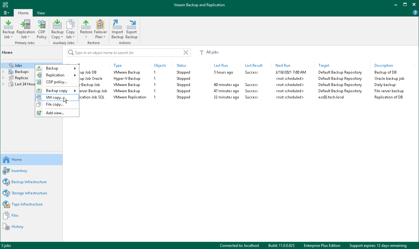 - Open the Home view. In the inventory pane, right-click Jobs and select VM Copy.