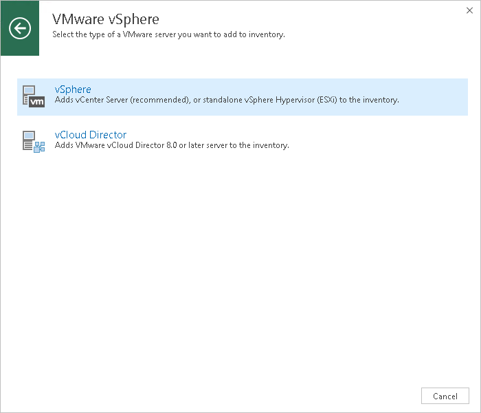 - Open the Backup Infrastructure view. In the inventory pane, select the Managed Servers node and click Add Server on the ribbon or right-click the Managed Servers node and select Add Server. In the Add Server window, click VMware vSphere > vSphere.