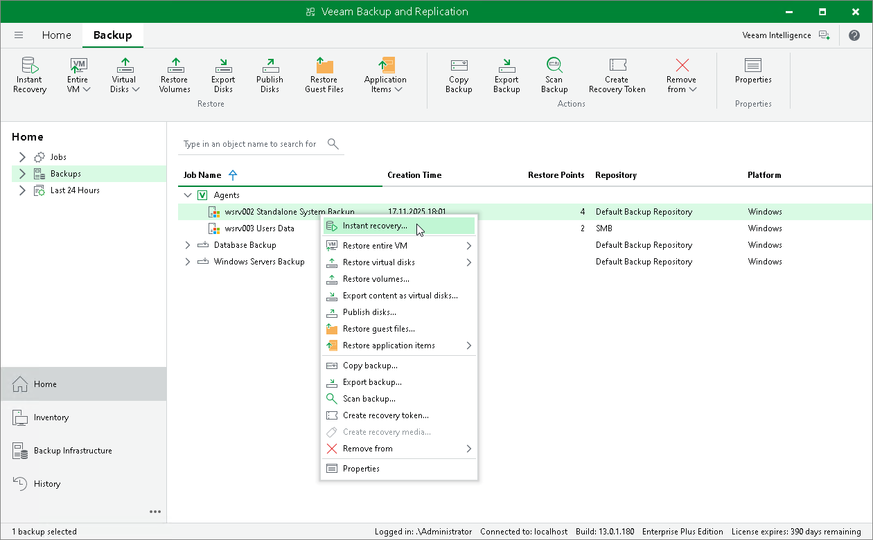In the Veeam Backup & Replication console, you can use Instant Recovery to restore a Veeam Agent computer as a VMware vSphere VM in your virtualization environment.