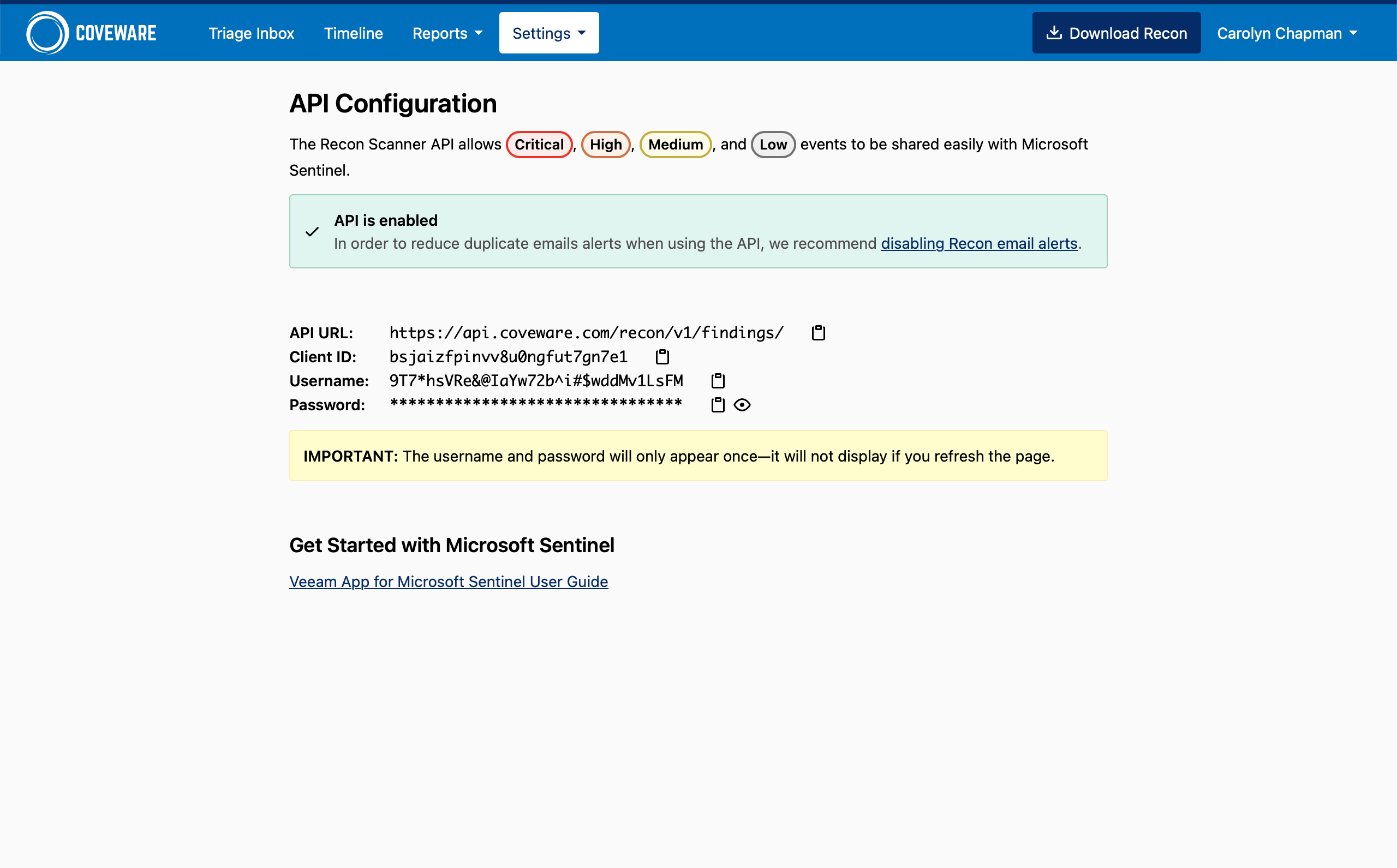 To enable the API, go to the API page Under Settings. Note that the username and password will only appear once. API URL, Client ID, Username, and password need to be set as part of the Microsoft Sentinel App Configuration in the Coveware settings.