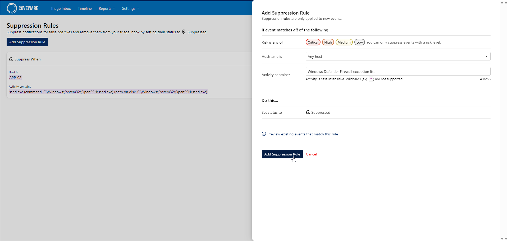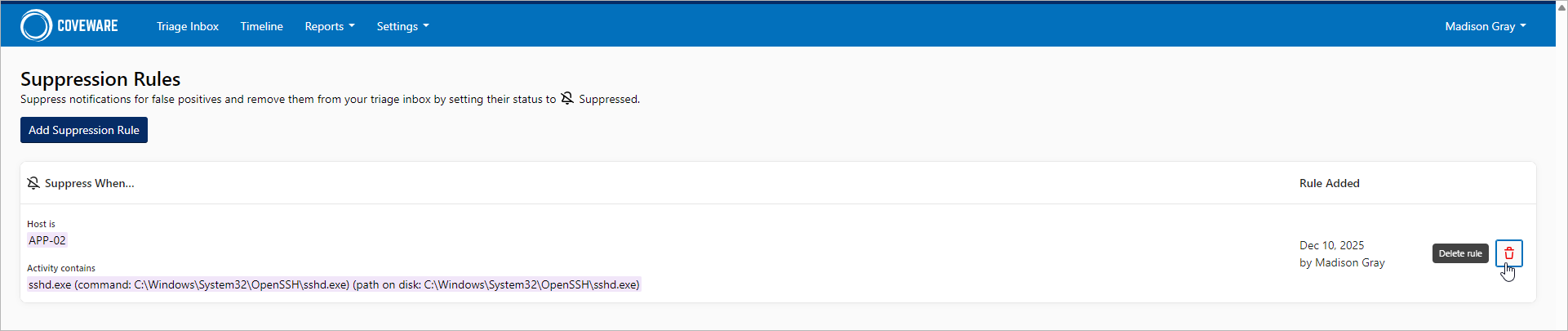 All suppression rules can be found in the Settings > Suppression Rules section. To create a custom suppression rule, do the following: