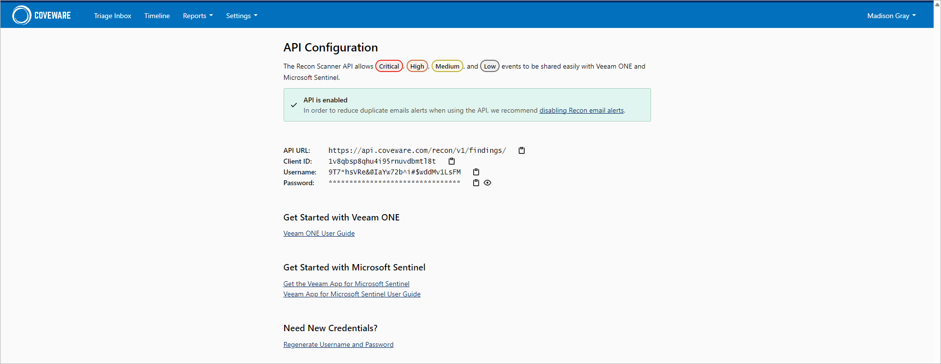 For more information on how to integrate Recon Scanner with Veeam App for Microsoft Sentinel, see the Configuring Coveware Settings section in the Veeam App for Microsoft Sentinel User Guide.