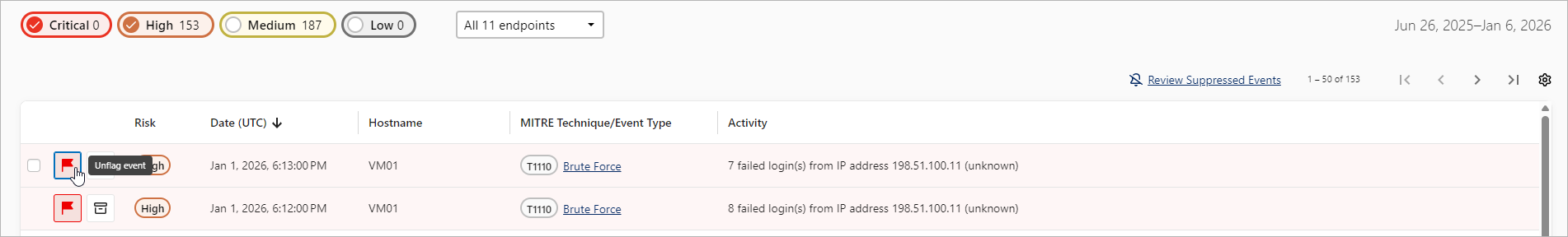 - Filter events by various parameters including status, time range, MITRE technique, risk level, endpoint, and so on.