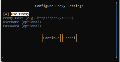 - Specify proxy settings if required. To complete the Recon Scanner installation, press [Continue].
