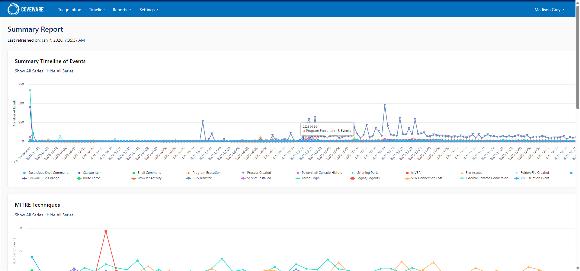 - Summary Report — Displays the breakdown of event types, MITRE techniques and endpoint events by day. Also includes a colored stacked bar chart displaying the breakdown of event types by endpoint.