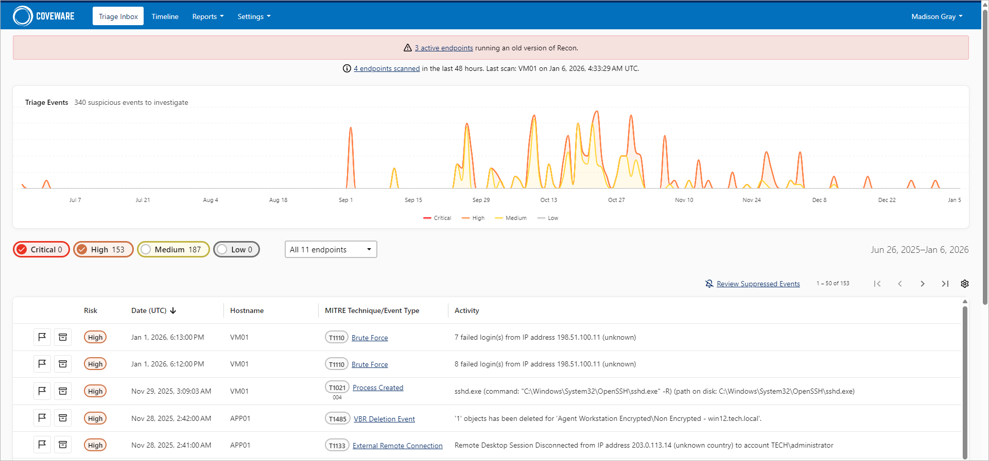 To view aggregated information on suspicious activity detected on machines where the scanner runs, log in to the Coveware portal and click Triage Inbox.