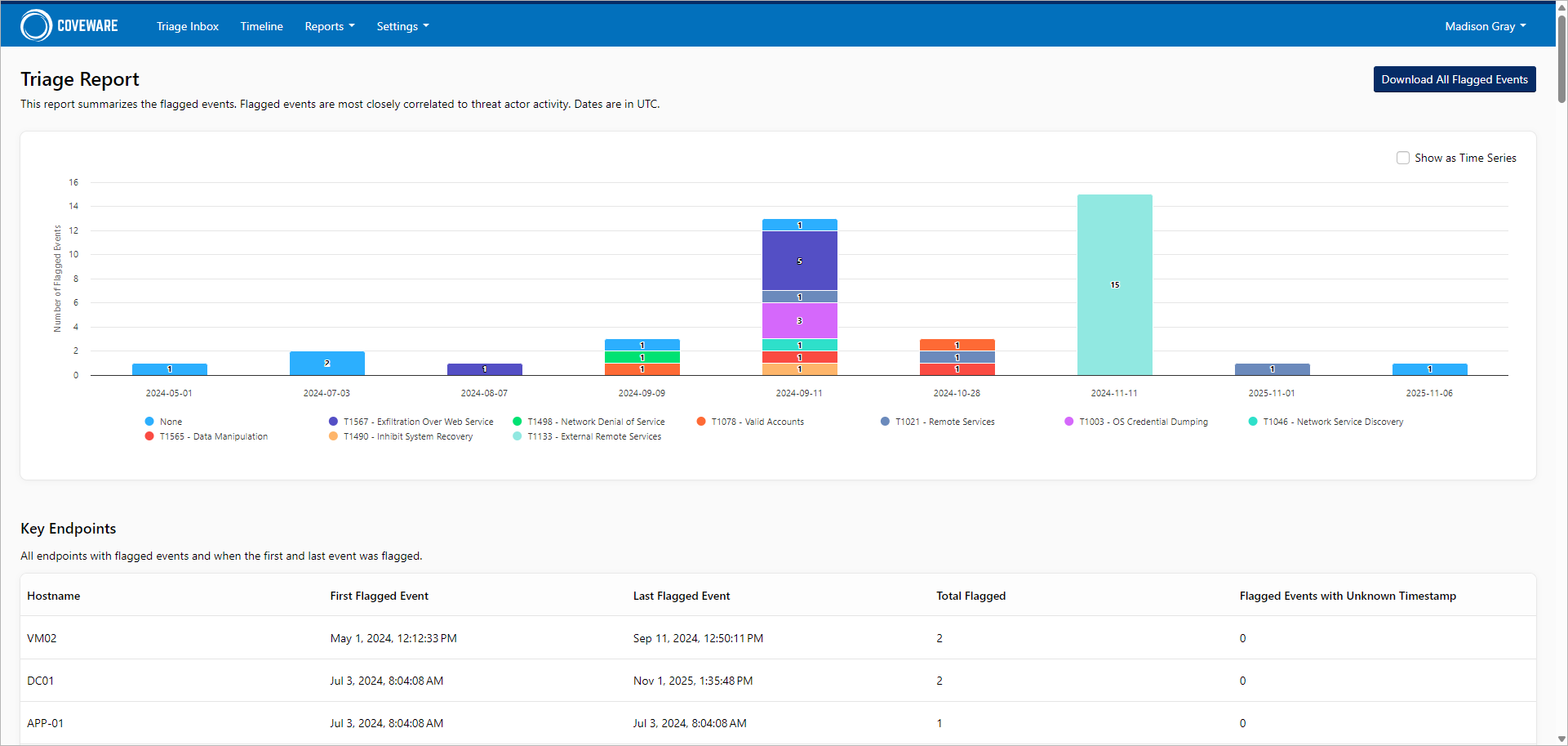- Triage Report — Displays aggregated information on flagged findings correlated with key endpoints and MITRE TTPs — Tactics, Techniques, and Procedures. Also includes mitigation summary.