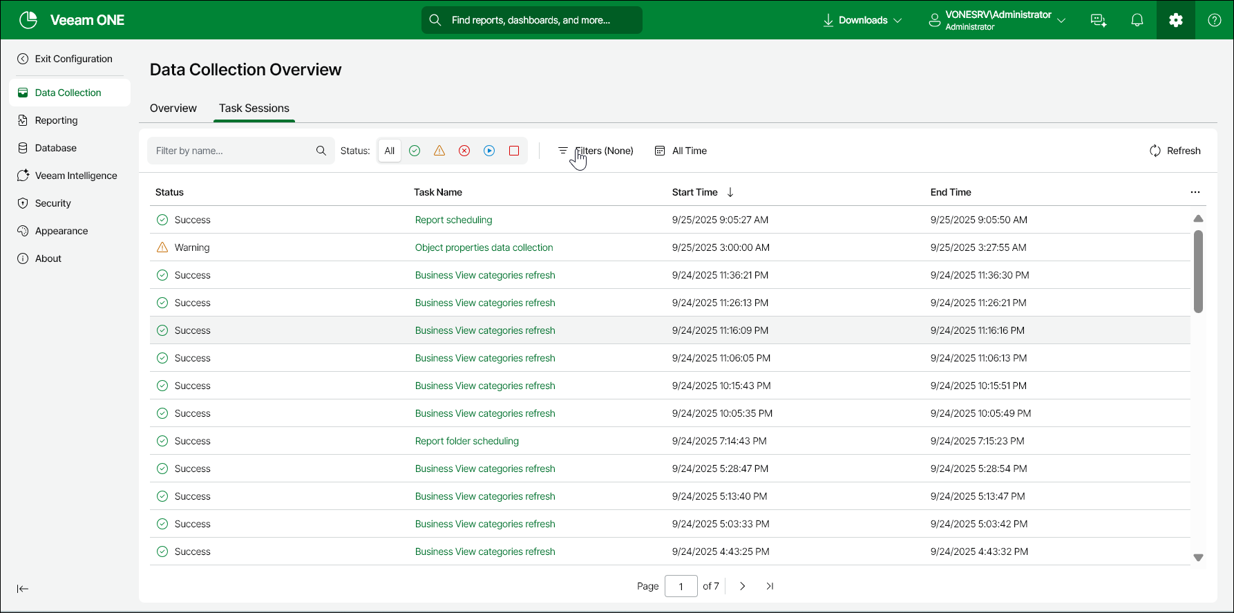 - Status — limit the list of sessions by status (Success, Warning, Failed, Processing, Stopped).