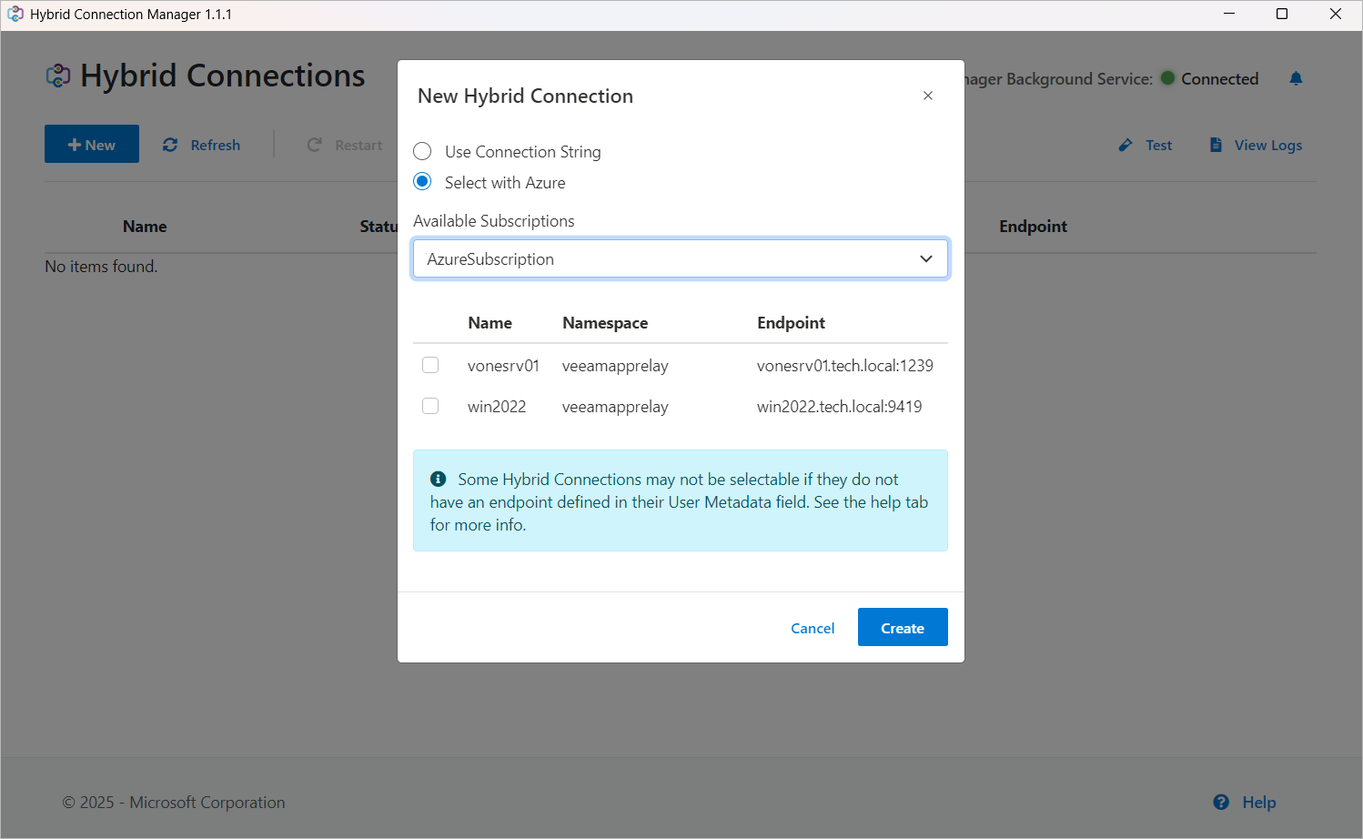 - Make sure that all Veeam servers you added to the Hybrid Connection Manager have the Connected value in the Azure Status column.
