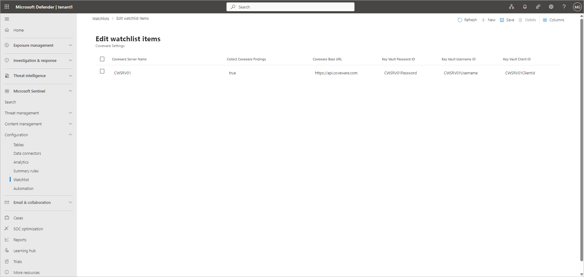 - On the My watchlists tab, select the Coveware Settings watchlist.