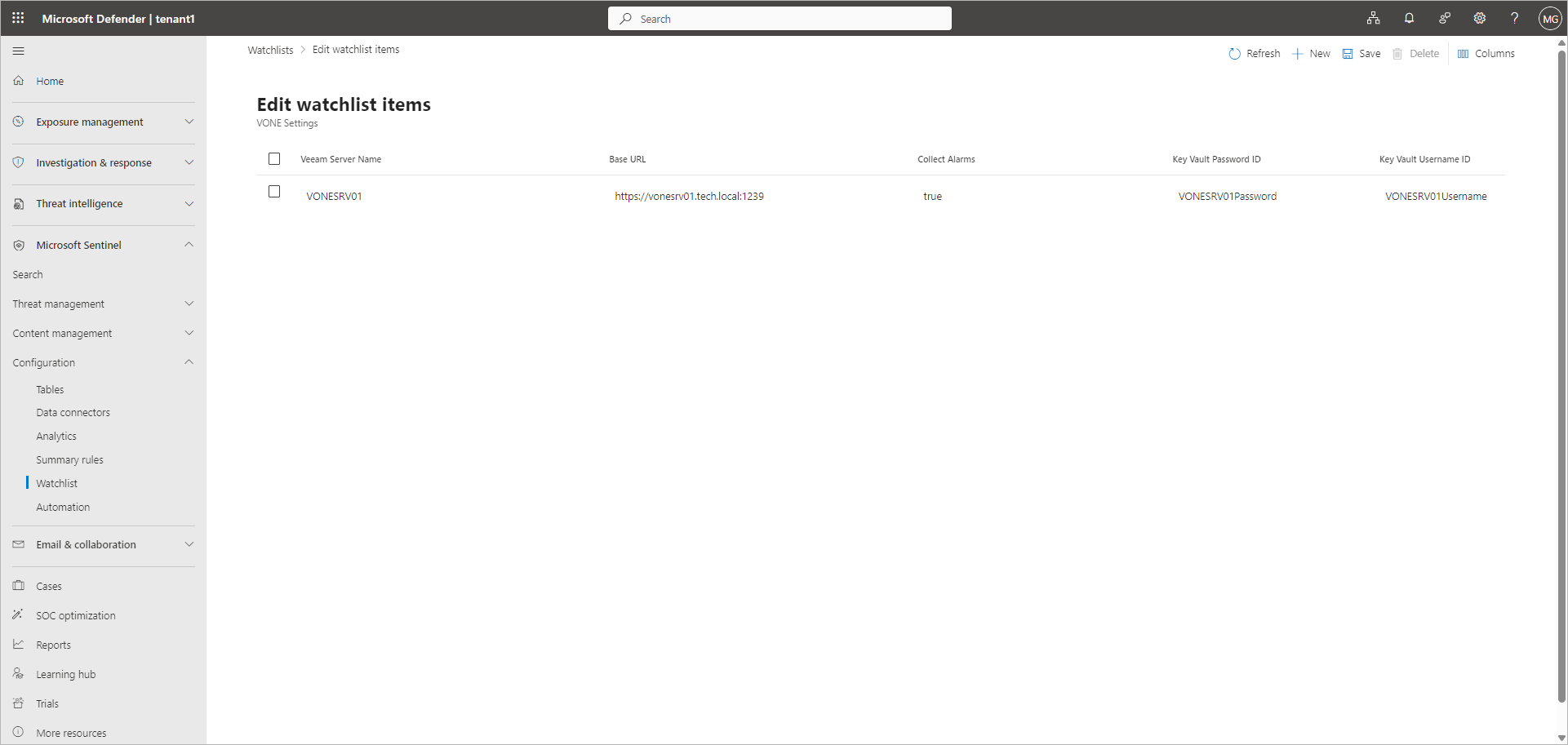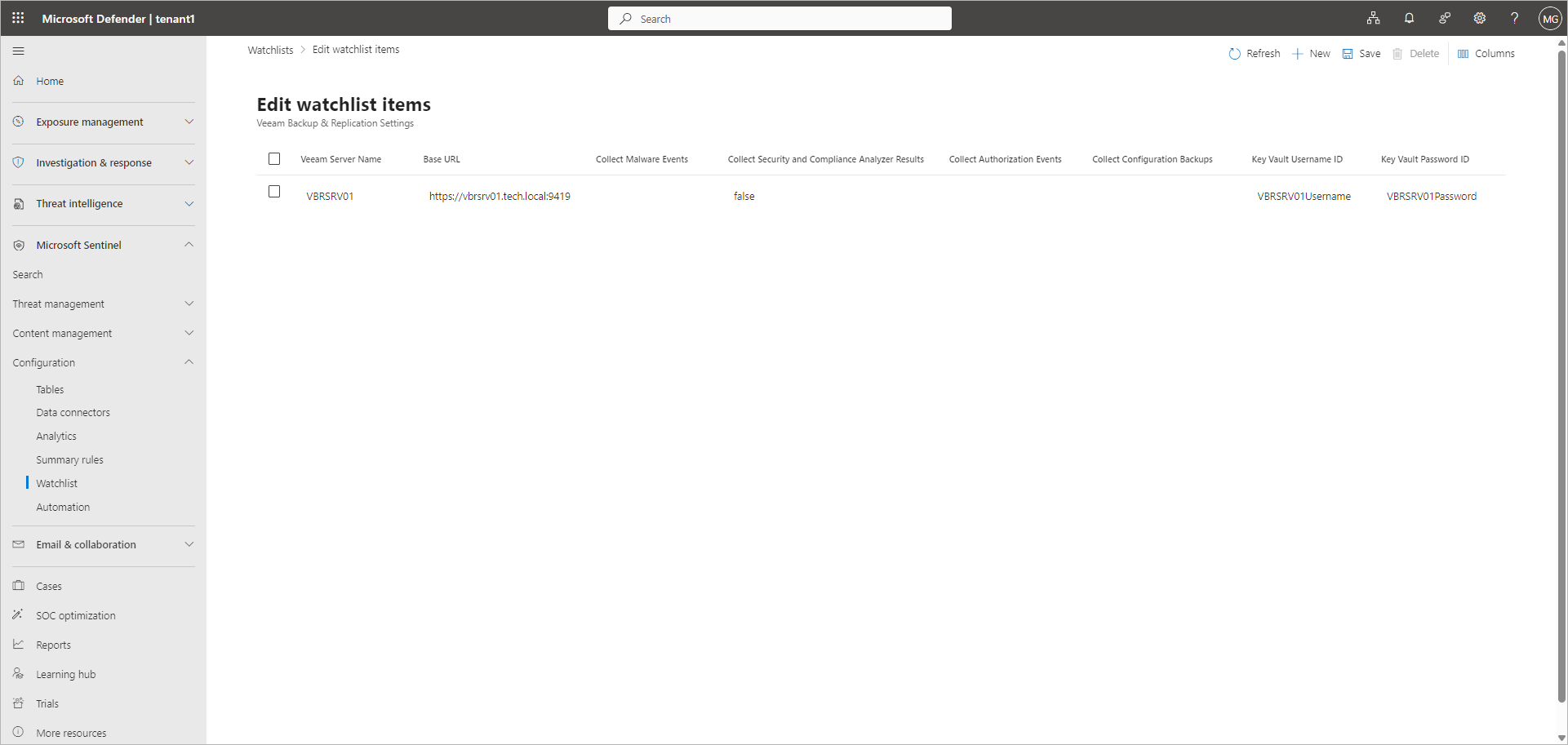 After you create the configuration playbook, configure the following watchlists required for Veeam connections: