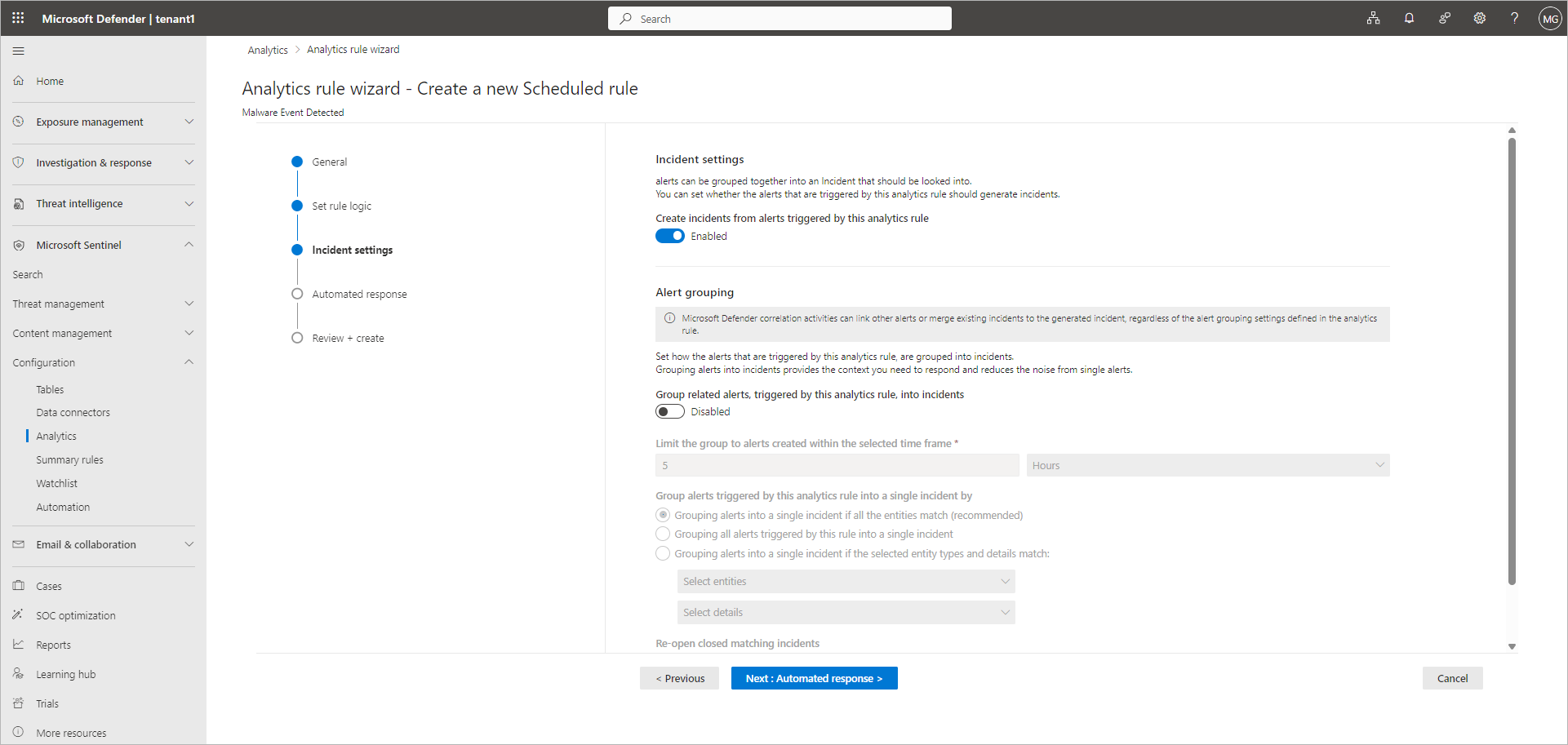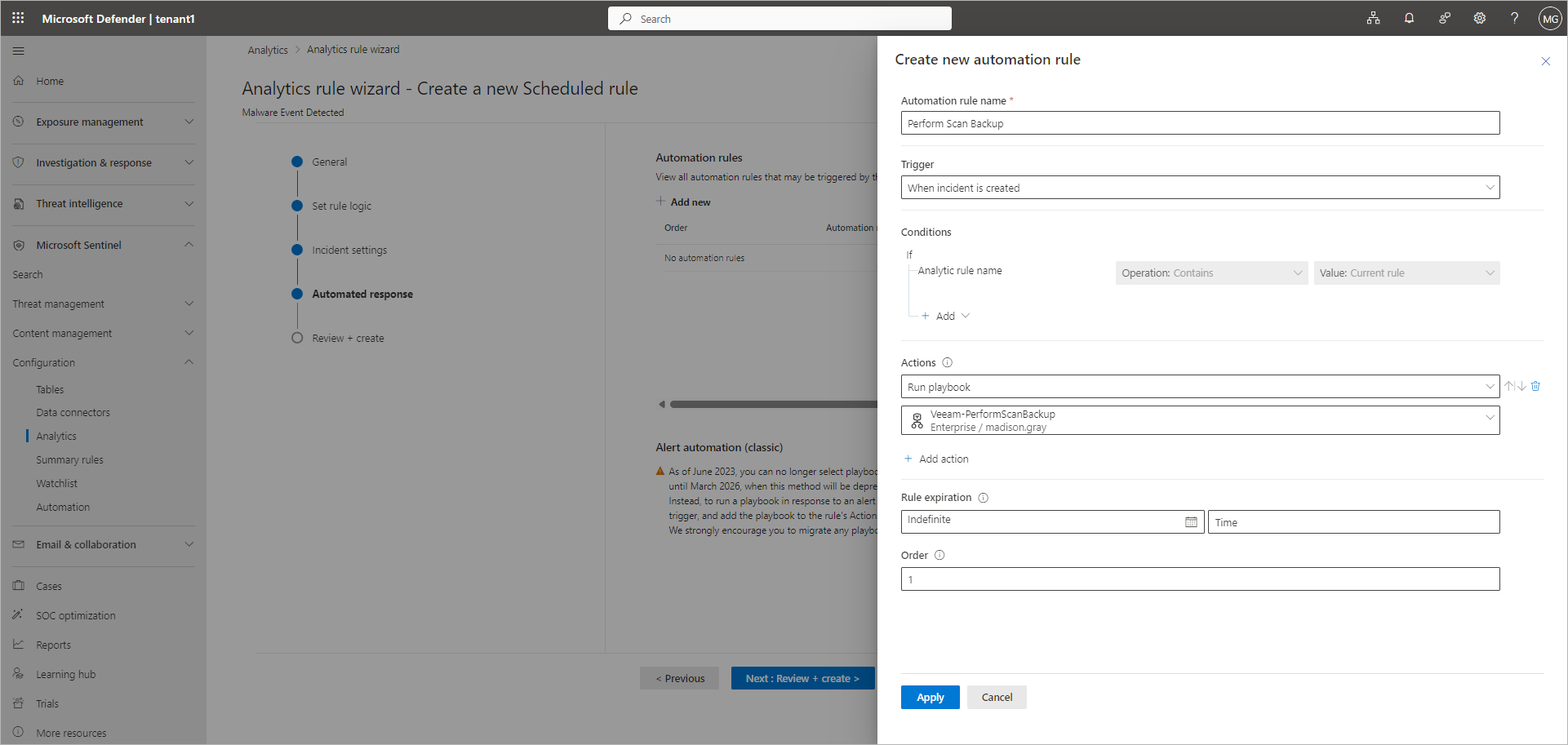 - At the Automated response step of the wizard, you can create an automation rule to run a Veeam playbook on specific condition, for example, when this analytics rule triggers an incident. To do this, perform the following steps: