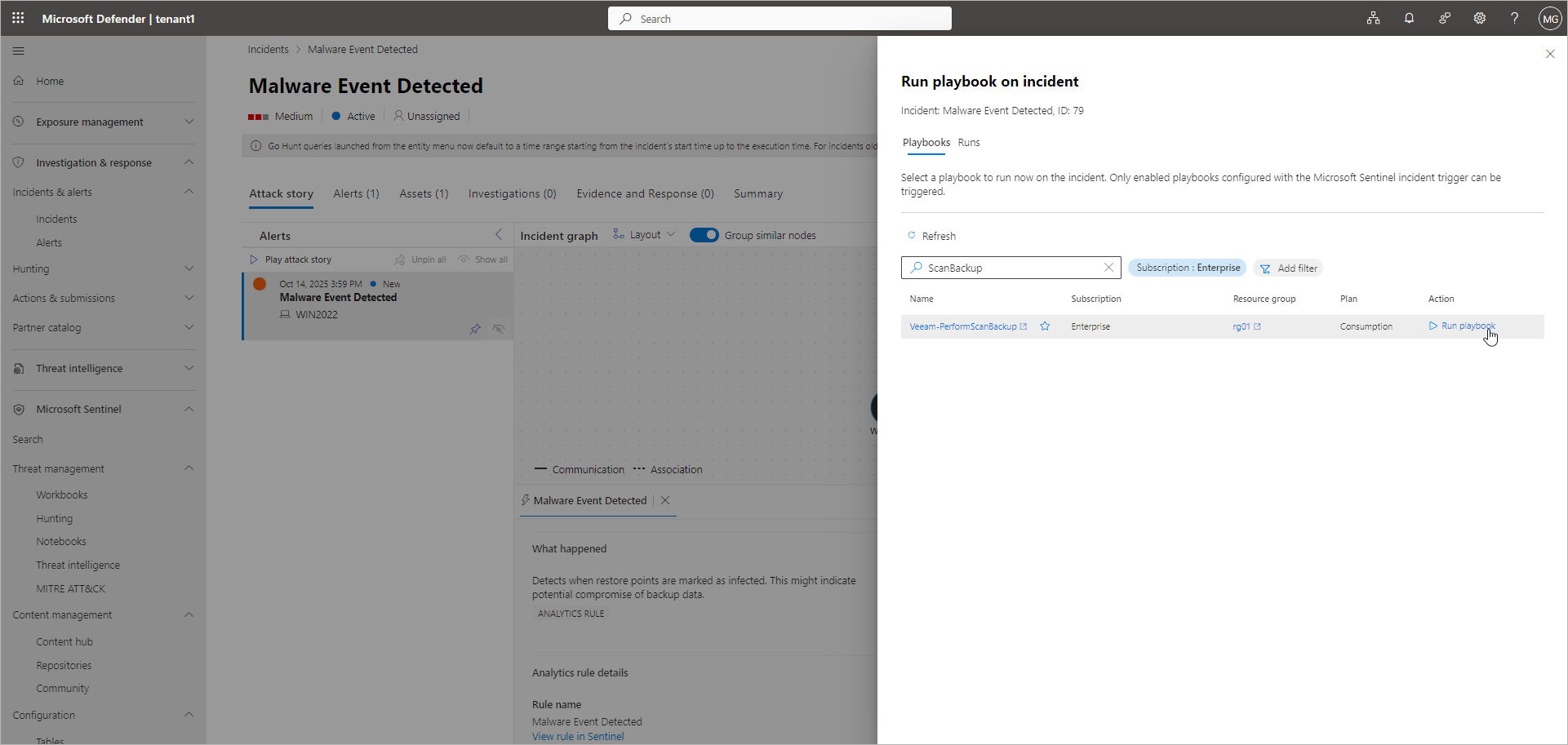 To run a Veeam playbook on the incident, perform the steps below. For more information on playbooks supported by Veeam App for Microsoft Sentinel, see Playbook Reference.