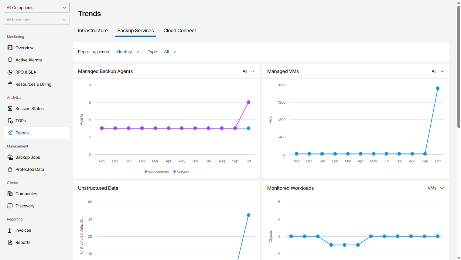 The Backup Services view provides summary information on managed Veeam backup agents and VMs, monitored and protected workloads for client and hosted backup infrastructures.