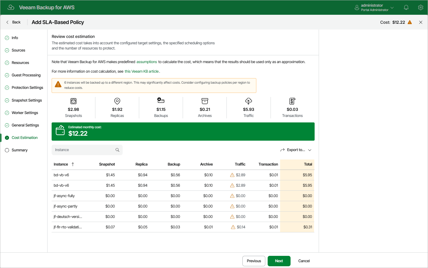 - The cost of transferring the instance data between AWS Regions during data protection operations (for example, if a protected instance and the target backup repository reside in different regions).