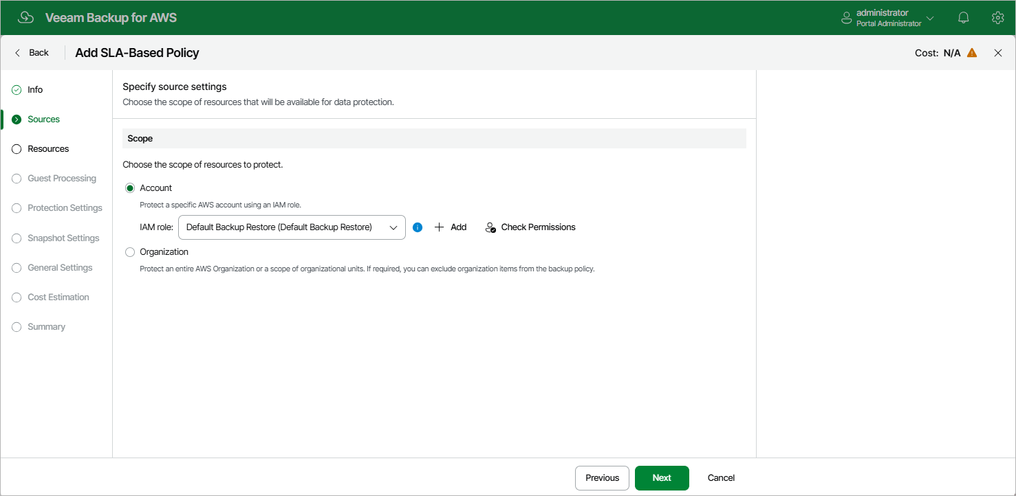 For an AWS Organization or a scope of organizational units to be displayed in the list of available identities, it must be added to Veeam Backup for AWS as described in section Adding AWS Organizations.