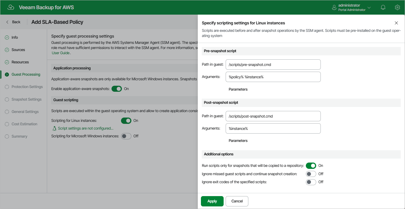 - Repeat step 1 for post-snapshot scripts in the Post-snapshot script section.