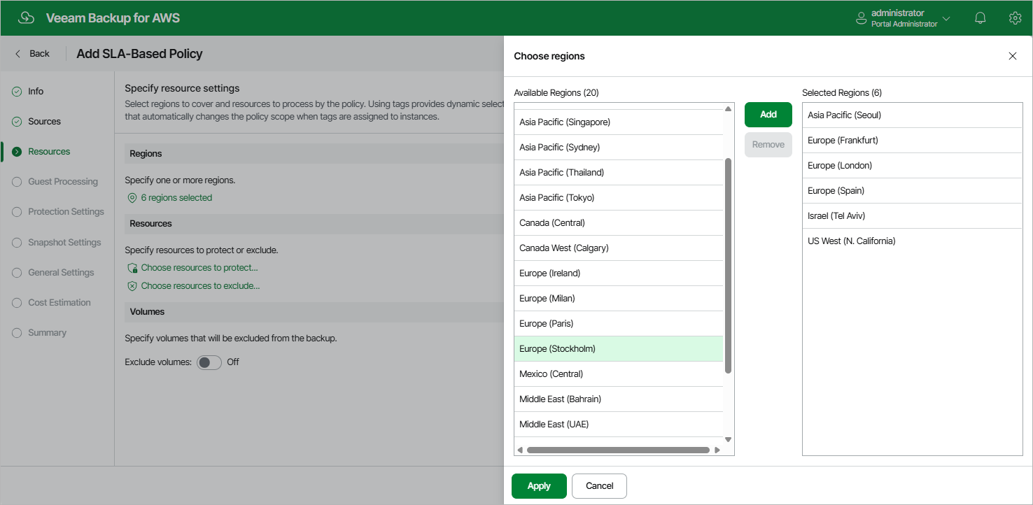 In the Regions section of the Resources step of the wizard, select AWS Regions where EC2 instances that you plan to back up reside:
