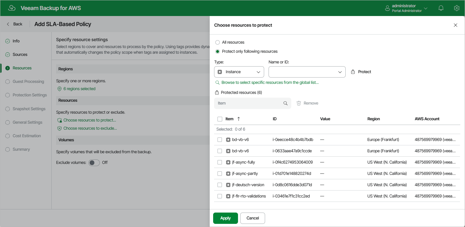 At the Resources step of the wizard, select AWS Regions where EC2 instances that you plan to back up, choose EC2 instances to back up, and specify EBS volumes of the selected EC2 instances to exclude from the backup policy.