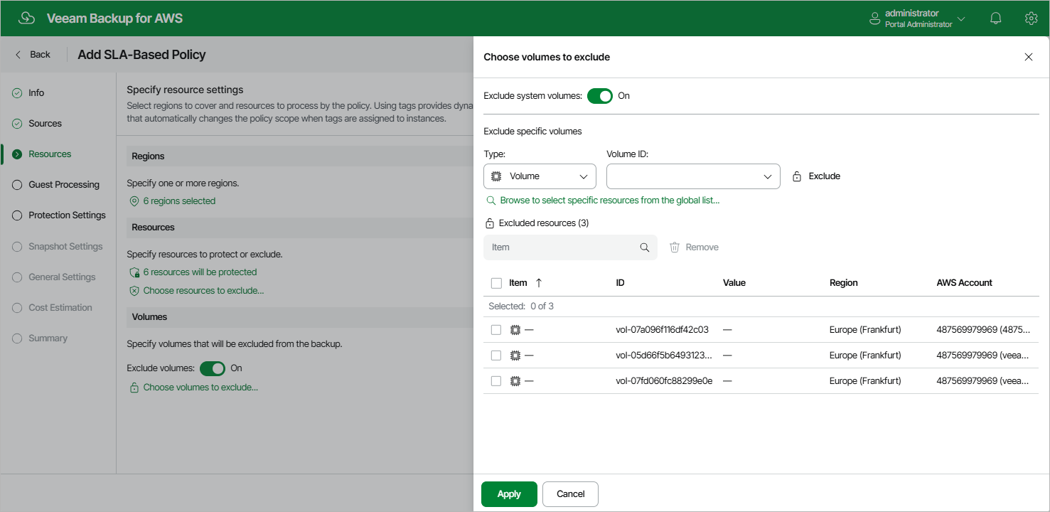 If you exclude an AWS tag from the backup scope, Veeam Backup for AWS will regularly check for new EBS volumes assigned the excluded AWS tag and automatically update the backup policy settings to exclude these volumes from the scope.