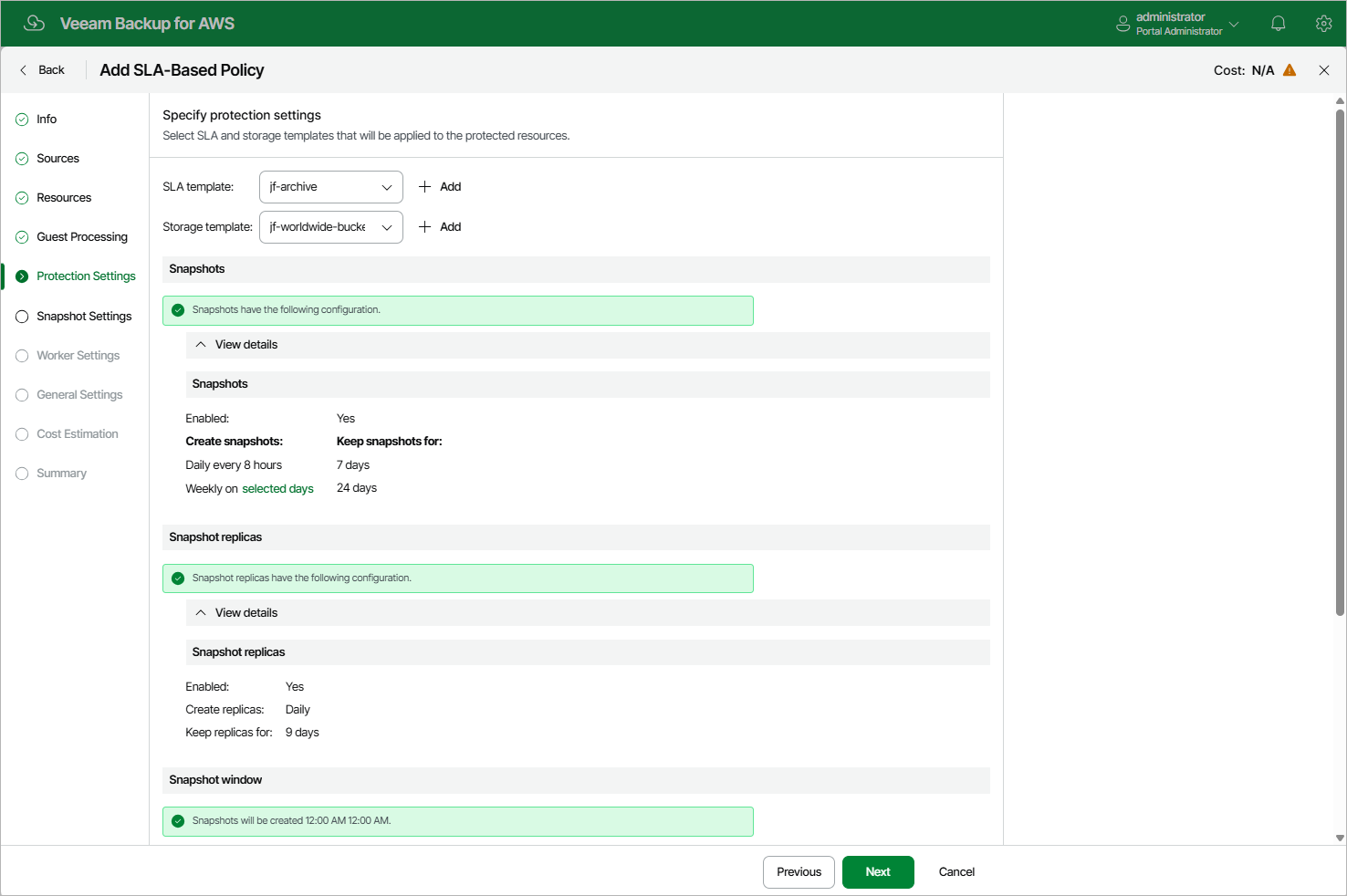 For an SLA template to be displayed in the list, it must be added to Veeam Backup for AWS as described in section Adding SLA Templates. If you have not added the necessary SLA template to Veeam Backup for AWS beforehand, you can do it without closing the SLA-Based Policy wizard. To do that, click Add and complete the Add SLA Template wizard.