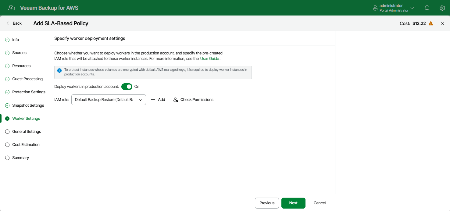 - If you have selected the Organization option, Veeam Backup for AWS will automatically choose an IAM role that will be attached to the worker instances and used by Veeam Backup for AWS to communicate with these instances. It will be one of the roles specified in the settings of the selected organization identity — either the IAM role whose permissions will be used to perform the backup operation (that is, the Production worker IAM role), or the IAM role that will be attached to the worker instances and used by Veeam Backup for AWS to communicate with these instances (that is, the Backup and restore IAM role).