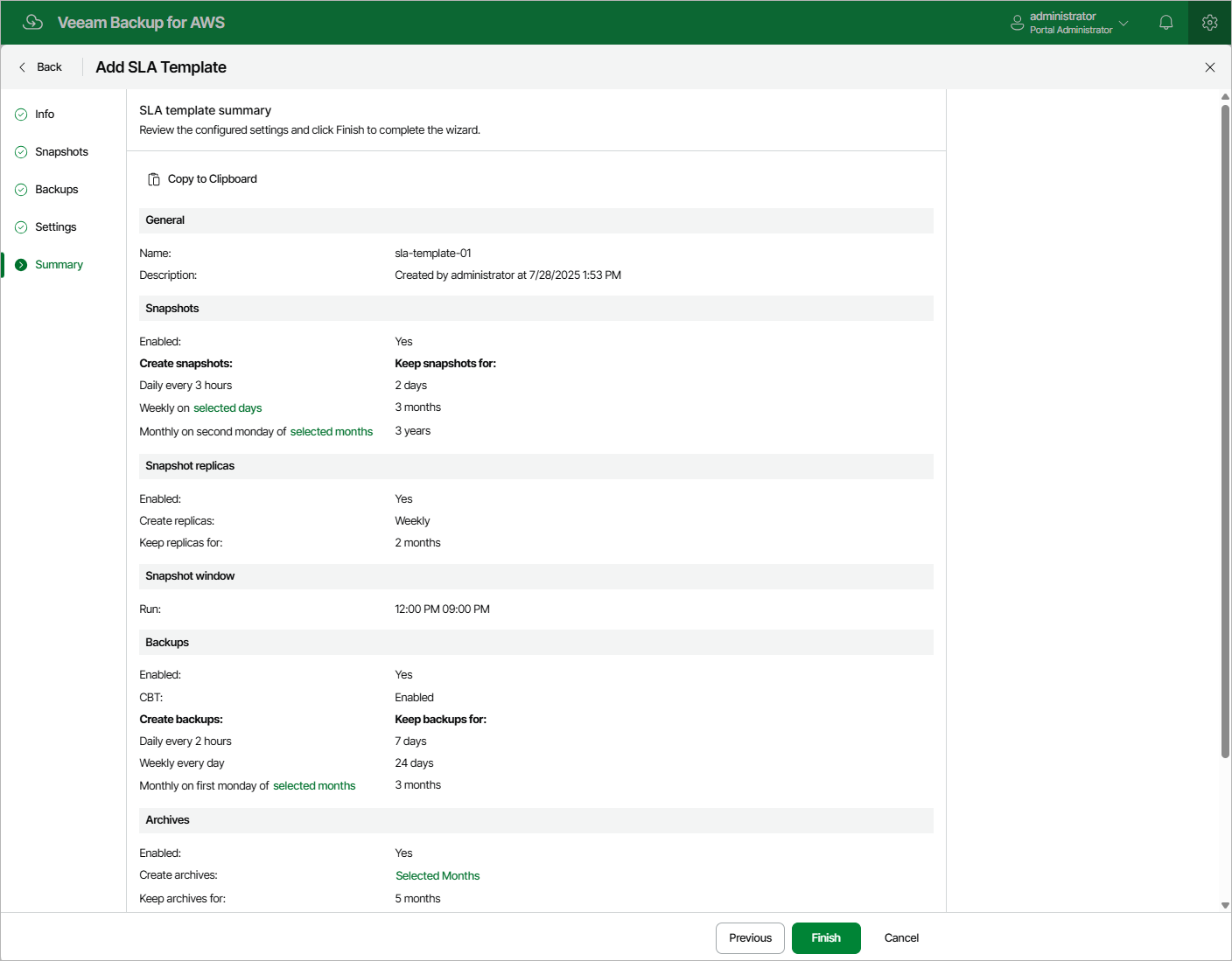 After you create an SLA template and assign it to a number of SLA-based backup policies as described in section Performing Backup Using Web UI, you will be able to see the full list of all the related policies on the SLA page. To do that, select the necessary template and click the link in the Currently Assigned column. |