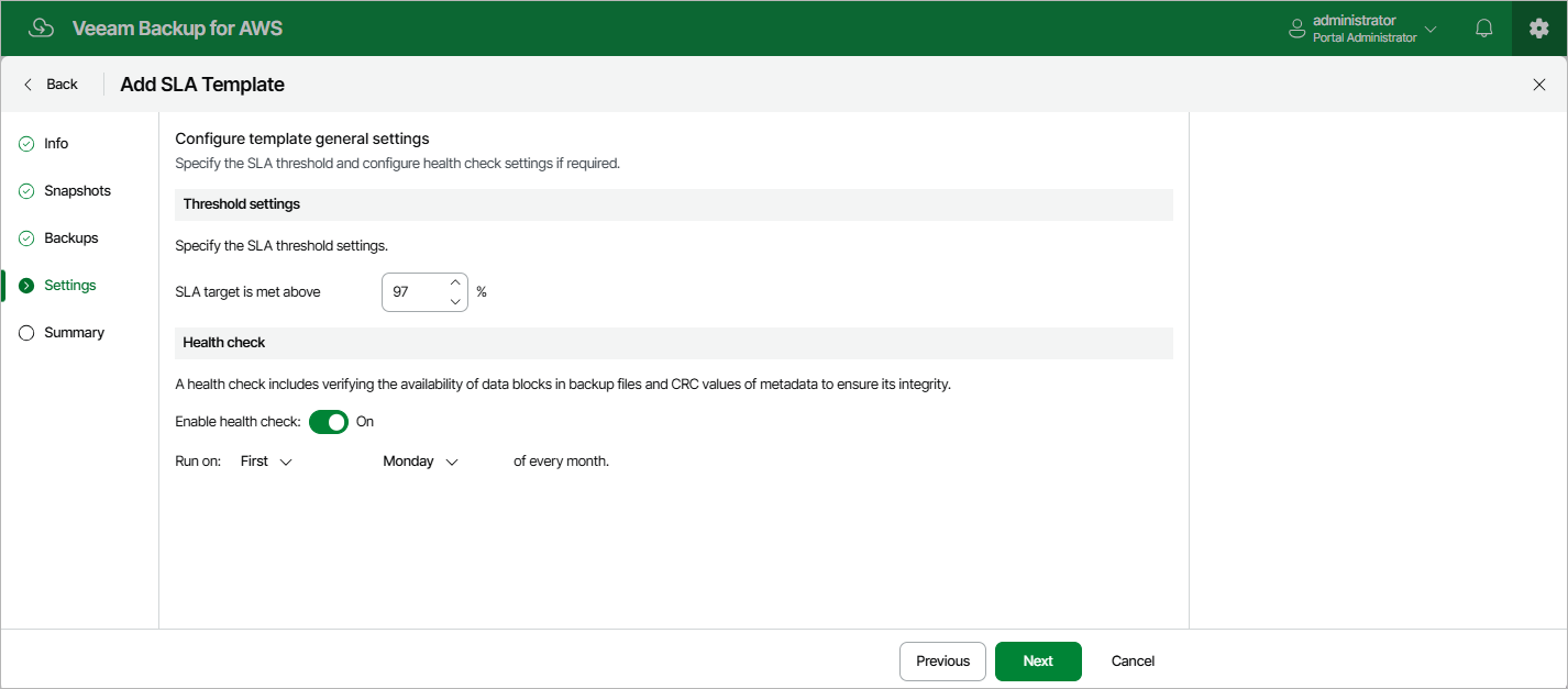 If you have configured a backup schedule at step 4 of the wizard, you can instruct Veeam Backup for AWS to periodically perform a health check for backup restore points created by all SLA-based backup policies that have this SLA template assigned. During the health check, Veeam Backup for AWS performs an availability check for data blocks in the whole regular backup chain, and a cyclic redundancy check (CRC) for metadata to verify its integrity. The health check helps you ensure that the restore points are consistent and that you will be able to restore data using these restore points. For more information on the health check, see How Health Check Works.