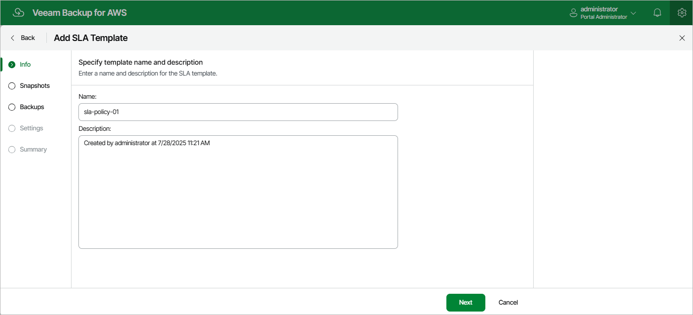 At the Info step of the wizard, use the Name and Description fields to enter a name for the new SLA template and to provide a description for future reference. The maximum length of the name is 127 characters; the maximum length of the description is 255 characters. The following characters are not supported: / \ " ' : | < > + = ; , ? ! * % # ^ @ & $ .