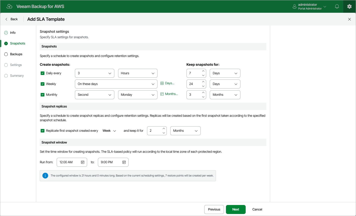 Veeam Backup for AWS automatically adjusts the specified snapshot window to the time zone of each AWS Region added to all SLA-based backup policies that have this SLA template assigned. For more information, see Data Protection Windows.
