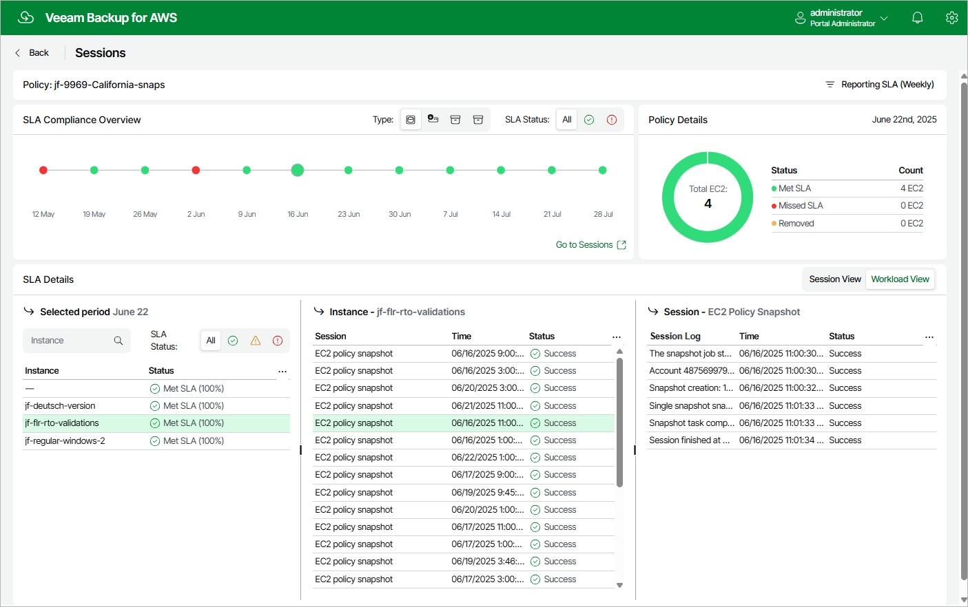 Veeam Backup for AWS allows you to monitor the protection status of all EC2 instances included into a specific SLA-based backup policy. As soon as Veeam Backup for AWS finalizes the data protection window in all the protected AWS Regions, the SLA details for this window are automatically added to the SLA Compliance Overview chart on the Sessions page. The chart shows whether the target SLA was met for different types of restore points (snapshots, snapshot replicas, backups and archived backups) created by the SLA-based backup policy.