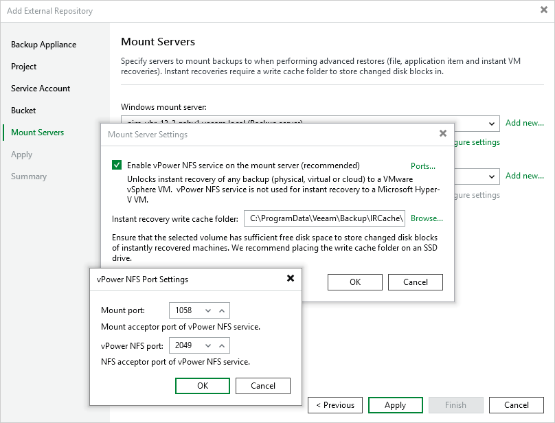 - Select the Enable vPower NFS service on the mount server check box to make the backup repository accessible by the Veeam vPower NFS Service.