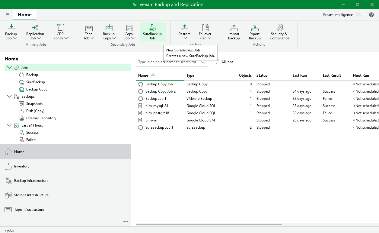 - Navigate to Jobs and click SureBackup Job on the ribbon.