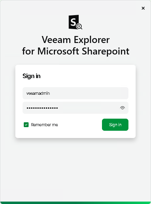 - Specify the user account credentials and click Sign in to log in to the backup server. Select the Remember me check box if you do not want to enter the credentials again the next time you sign in to this backup server.