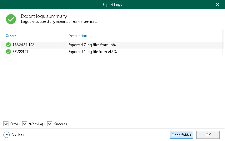 Once log files are collected, Veeam Backup for Microsoft 365 prompts you to view logs collection statistics by expanding the Export Logs dialog. You can open a folder where log files were exported. To do this, click Open folder.