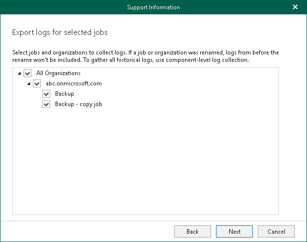 - Select backup and backup copy jobs for which to obtain log files. Logs will be collected for the selected jobs and for all backup proxy servers involved in the processing of these jobs. Additionally, Veeam Backup for Microsoft 365 collects information about general settings of the product and the backup infrastructure components, as well as Veeam Backup for Microsoft 365 license details.