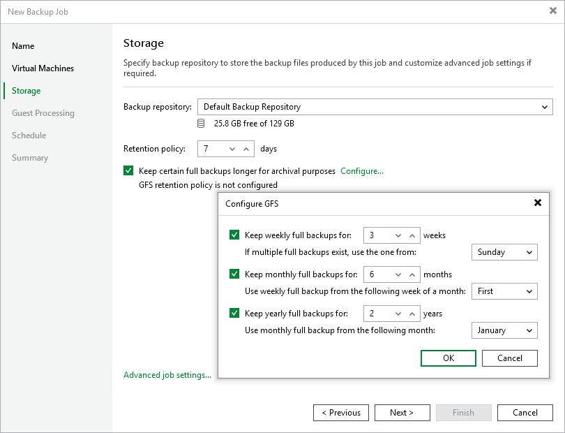 To configure a GFS policy schedule, select the Keep certain full backups longer for archival purposes check box and click Configure. Then, specify the following options in the Configure GFS window: