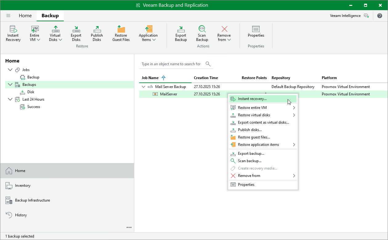 With Instant VM Recovery, you can immediately restore Proxmox VE VMs as VMware vSphere, Microsoft Hyper-V or Nutanix AHV VMs to your production environment by running them directly from their backups. Instant VM Recovery helps you improve recovery time objectives and minimize disruption and downtime of production workloads. For more information on Instant VM Recovery, see the Veeam Backup & Replication User Guide, section VM Recovery.