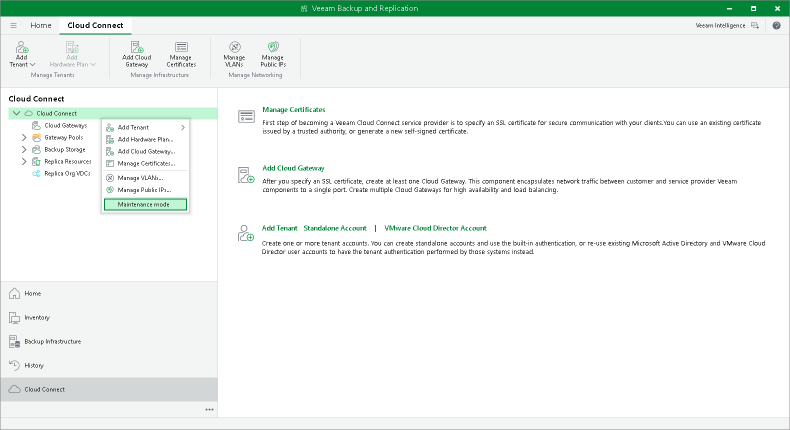 - In the inventory pane, right-click the Cloud Connect node and select Maintenance mode.