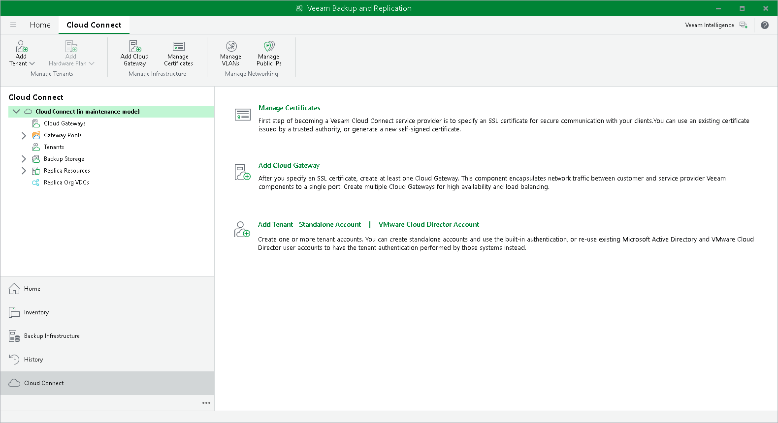 To bring the SP backup server back to the normal operational mode, right-click the Cloud Connect node and select Maintenance mode once again.