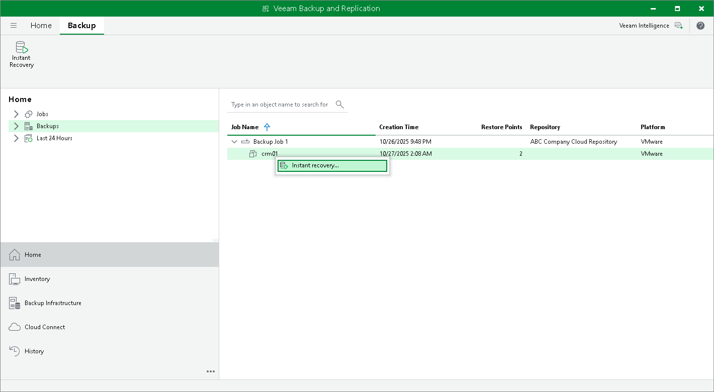 - In the working area, click the backup whose data you want to restore to a VMware vSphere VM and click Instant Recovery on the ribbon or right-click the necessary backup and select Instant recovery.