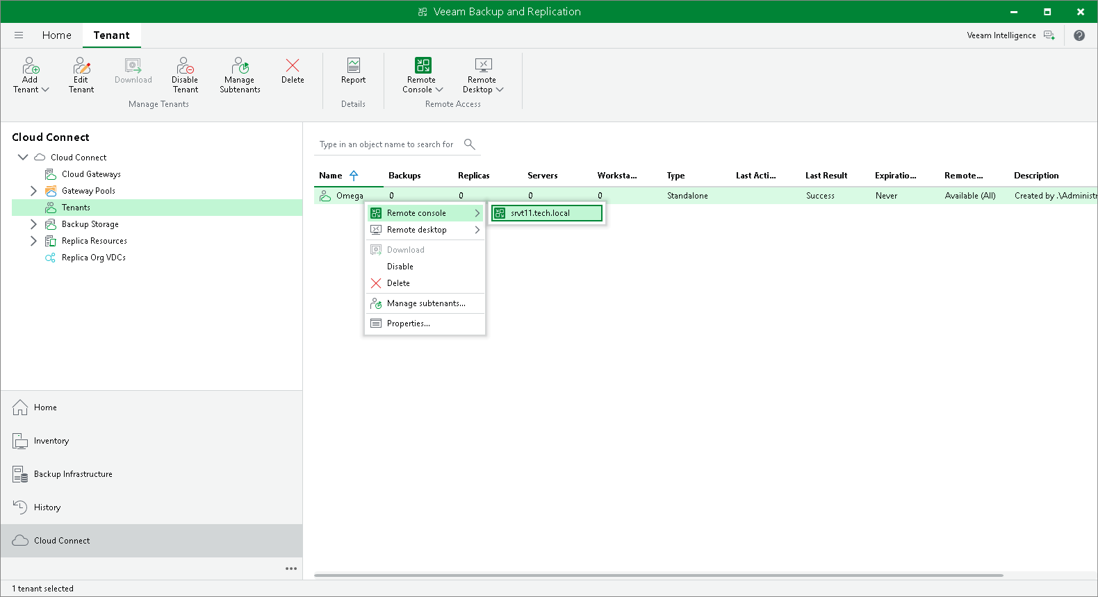 - Select the tenant in the working area, click Remote Console on the ribbon and select the backup server to which you want to connect or right-click the tenant in the working area, select Remote console and select the backup server to which you want to connect.