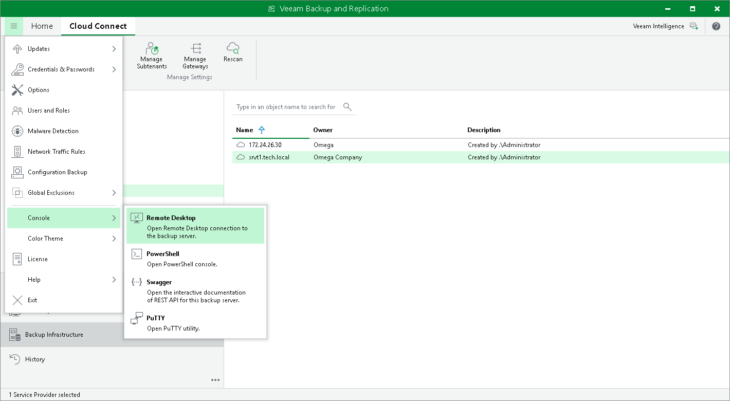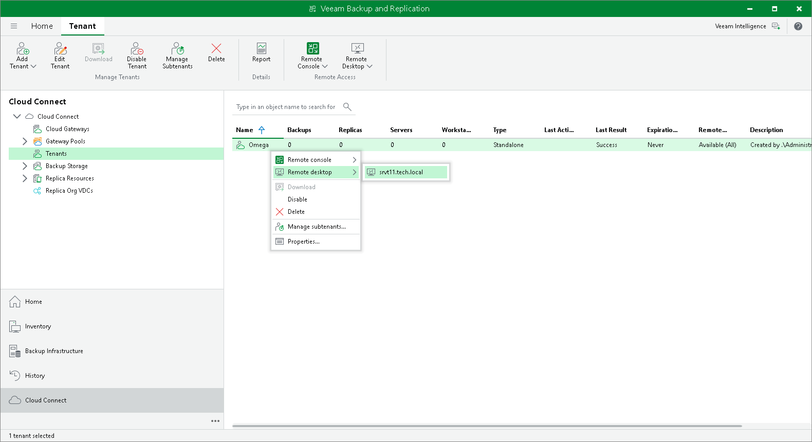 - In the Veeam Backup & Replication console running on the SP backup server, in the Cloud Connect view, click the Tenants node. Right-click the necessary tenant in the working area, select Remote Desktop and select the backup server to which you want to connect.