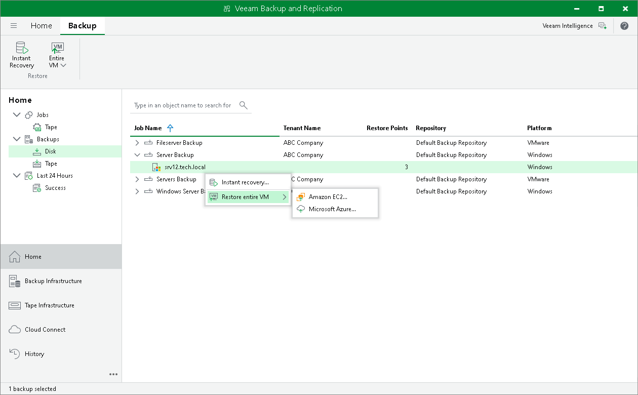 - Select the Backups node in the inventory pane. Expand the backup in the working area, select the necessary VM, select Entire VM and click Amazon EC2 on the ribbon or right-click the backup and select Restore entire VM and click Amazon EC2.