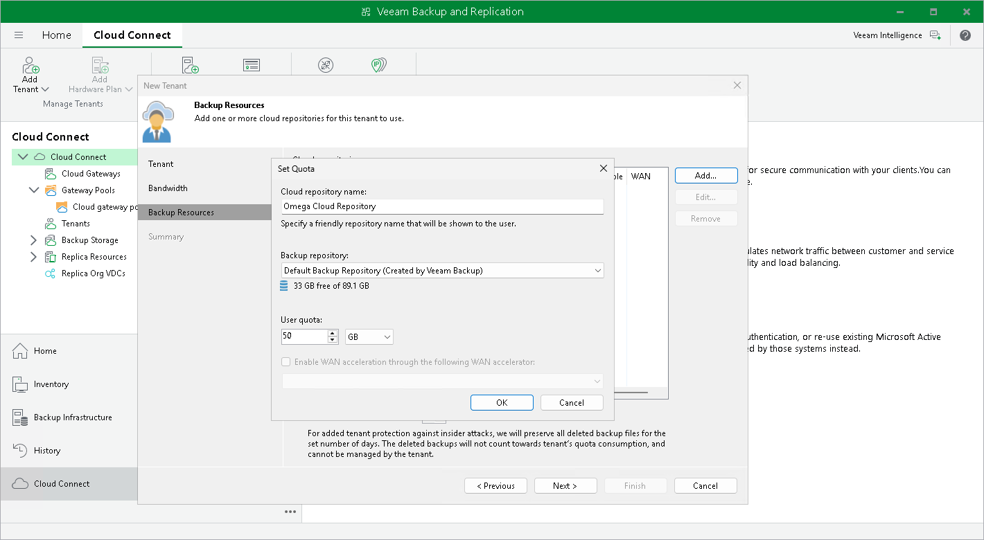 A cloud repository is a regular backup repository configured on the SP side. When the SP creates a tenant account, the SP can assign a storage quota (allocates some amount of storage space) on this backup repository for the tenant. The tenant can be assigned different quotas on different backup repositories. As soon as the tenant connects to the SP, Veeam Backup & Replication retrieves information about all quotas for this tenant and displays a list of available cloud repositories in the tenant backup infrastructure.